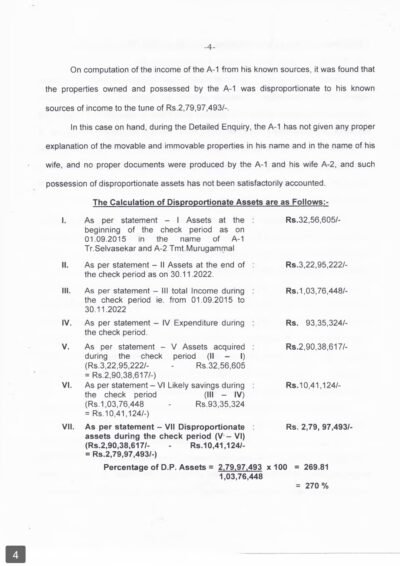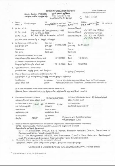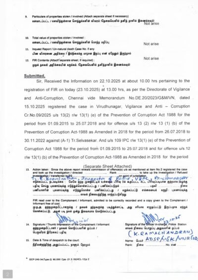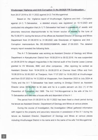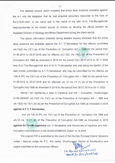 அதன் மீதான விசாரணை செய்து 2023 இல் குற்ற நடவடிக்கை உறுதி செய்து பல்வேறு அலுவல் ஆய்வுக்குப் பின்பு இன்று திண்டுக்கல் மாவட்ட லஞ்ச ஒழிப்புத்துறை யினருக்கு தகவல் தெரிவிக்கப்பட்டது.