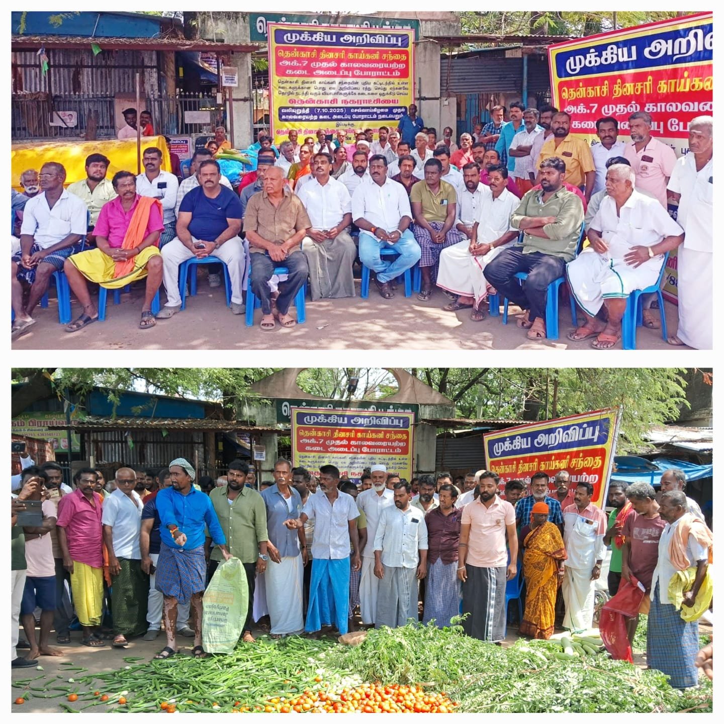 புளியங்குடி நகராட்சி மற்றும் பாளையங்கோட்டை மாநகராட்சிக்கு பாத்தியப்பட்ட காய்கனி சந்தையில் உள்ள காய்கனி வியாபாரிகளுக்கு இது போன்ற சூழ்நிலையில் பழைய மார்க்கெட் கடைகளை இடித்து புதிய மார்க்கெட்டில் உள்ள கடைகளை ஏற்கனவே வியாபாரம் செய்து வந்த காய்கனி வியாபாரிகளுக்கே புளியங்குடி நகராட்சி, பாளையங்கோட்டை மாநகராட்சி நிர்வாகம் கொடுத்துள்ளது. 01.10.2025 ம் தேதி தென்காசி நகராட்சியில் இருந்து ஏலம் மற்றும் ஒப்பந்தப்புள்ளி அறிவிப்பு என்ற நோட்டீஸ் பத்திரிக்கை செய்தி தாளில் வெளியிடப்பட்டுள்ளது. இதனால் சிறு வியாபாரிகளாகிய எங்களுக்கு, பெரும் பணக்காரர்களிடம் போட்டியிடும் சூழ்நிலையும், அதனால் எங்கள் வாழ்வாதாரத்தை இழந்து தொழில் நடத்துவதற்கு கடைகள் கிடைக்காத சூழ்நிலையும் ஏற்படும் என்கின்ற அச்சத்தில் வியாபாரிகள் அனைவரும் உள்ளோம். இதனால் சிறு வியாபாரிகளாகிய நாங்கள் வேறு வழியின்றி பொது ஏலம் ரத்து செய்யும் வரை எங்கள் கடைகளை 07.10.2025ம் தேதியில் இருந்து கால வரையரையற்ற கடை அடைப்பு போராட்டம் நடத்துகிறோம்.